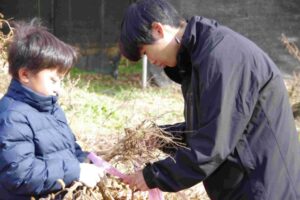 大豆を枝のまま抜き、葉っぱを落として、束ねる作業を行いました。