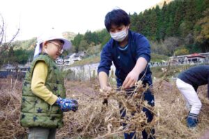 大豆を枝のまま抜き、葉っぱを落として、束ねる作業を行いました。