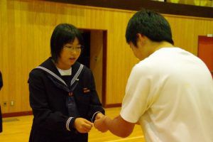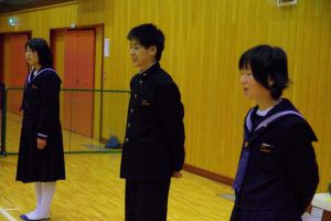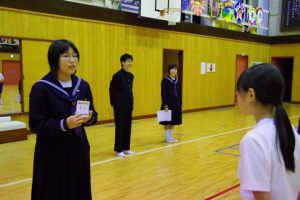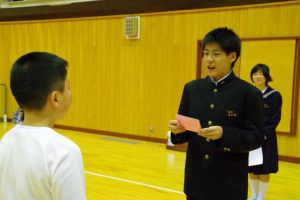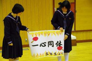 この日のために、3年生は1・2年生には内緒で壮行会の内容を考え、こっそりプレゼントを作っていました。1・2年生の一人一人に、試合で頑張って欲しいことが一言で書かれたメッセージを渡し、なぜその言葉を送ったのか伝えていました。最後には「一心同体」と書かれた横断幕を披露してくれました。3年生らしい、心のこもったメッセージに、1・2年生も気持ちが引き締まった様子でした。