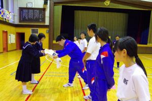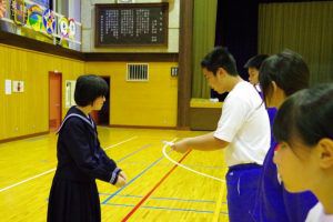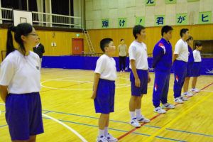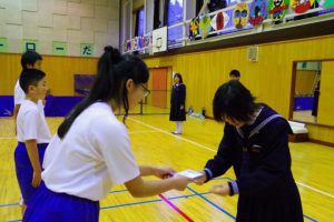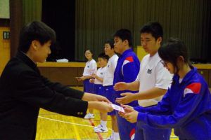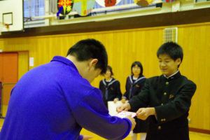 この日のために、3年生は1・2年生には内緒で壮行会の内容を考え、こっそりプレゼントを作っていました。1・2年生の一人一人に、試合で頑張って欲しいことが一言で書かれたメッセージを渡し、なぜその言葉を送ったのか伝えていました。最後には「一心同体」と書かれた横断幕を披露してくれました。3年生らしい、心のこもったメッセージに、1・2年生も気持ちが引き締まった様子でした。