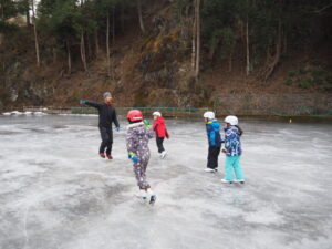 スケートの上達には、とにかく回数あるのみ!と、ご指導してくださる方がおっしゃっていた通り、子どもたちは、保育所の頃から滑っていたり、冬休みにもその村内のスケートリンクで何度も滑っていたりするので、とっても上手です!